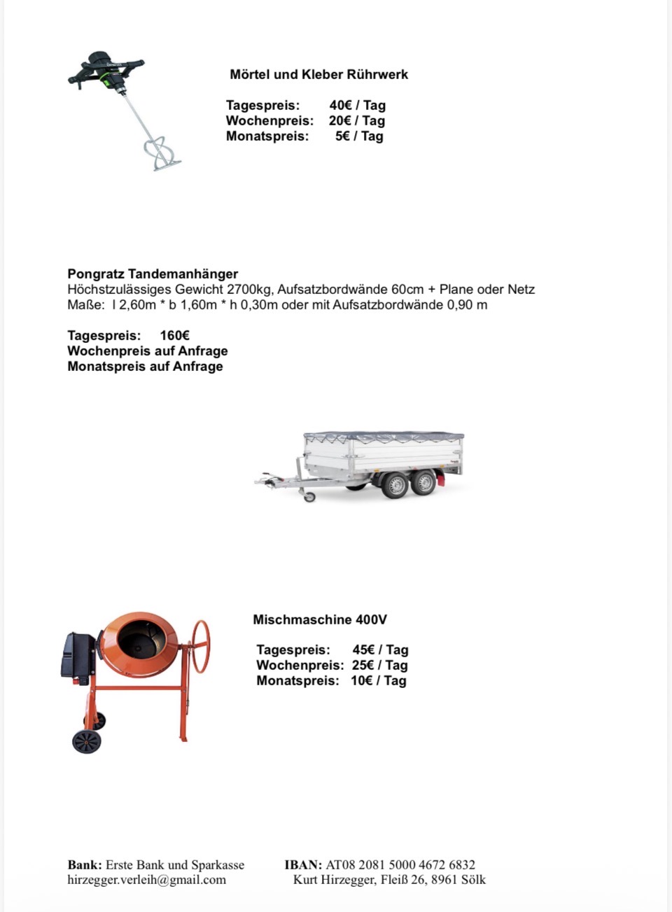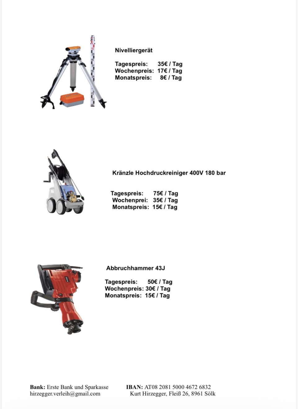 Bei unserem Baumaschinenverleih in Sölk im Bezirk Liezen erwarten dich faire und transparente Mietpreise. Die Preise sind abhängig von der Mietdauer, dem Gerätetyp und eventuellen Zusatzleistungen wie Zustellung oder Abholung. Auf unserer Preisliste findest du alle aktuellen Tarife übersichtlich dargestellt. So kannst du die Kosten von Anfang an genau kalkulieren und dein Projekt sicher planen.